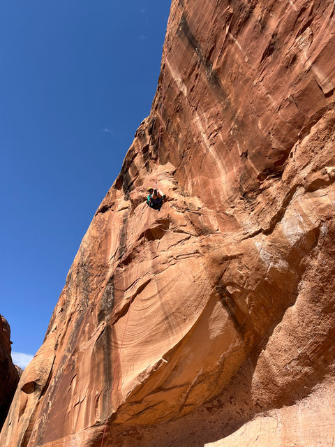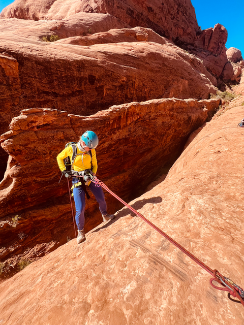 What to expect: After a 15 minute drive from Moab, we will park and hike to the canyon. The hike usually takes around 30-45 minutes, with a slight incline. This canyon is dry year round, with limited shade. The first rappel is a short, 12' drop that is a great introduction. The next rappel is the whopper: a 110' free hanging rappel (meaning your feet don't touch the rock for most of the way down). The third rappel is short, but on a beautiful slab carved from water, and the final rappel, the most technical, lands us back on ground level where we started. This is a great trip because we don't repeat any part of it, it's a beautiful loop through canyon country.